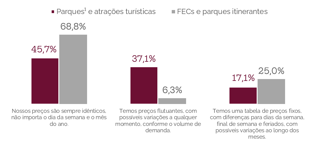 Os parques e atrações que adotam estratégias de precificação têm 4 p.p. a mais de parques na faixa de EBITDA acima 40% e 9 p.p. a mais na faixa de 10% a 40%, reforçando os ganhos dessas práticas na rentabilidade do negócio.
